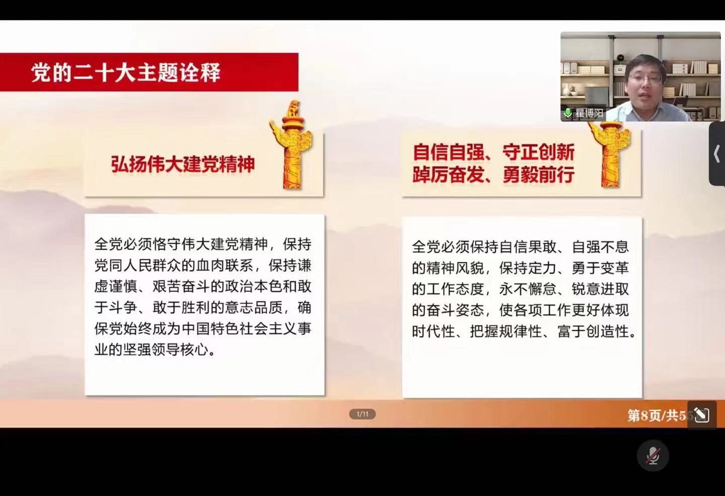 瞿校长从“大会的主题和主要成果”“过去五年的工作和新时代十年的伟大变革”“马克思主义中国化、时代化”“中国式现代化”“全面建设社会主义现代化国家的目标任务”“坚持党的全面领导和全面从严治党”“发扬斗争精神,坚持团结奋斗,应对风险挑战”“新时代党的青年工作”八个方面,对党的二十大精神进行了系统深入宣讲。瞿校长指出党的二十大精神内涵十分丰富,需要我们深入学、反复学、持续学,号召全体党员紧密团结在以习近平同志为核心的党中央周围,高举中国特色社会主义伟大旗帜,全面贯彻习近平新时代中国特色社会主义思想,坚定信心、同心同德,埋头苦干、奋勇前进,为全面建设社会主义现代化国家、全面推进中华民族伟大复兴而团结奋斗。