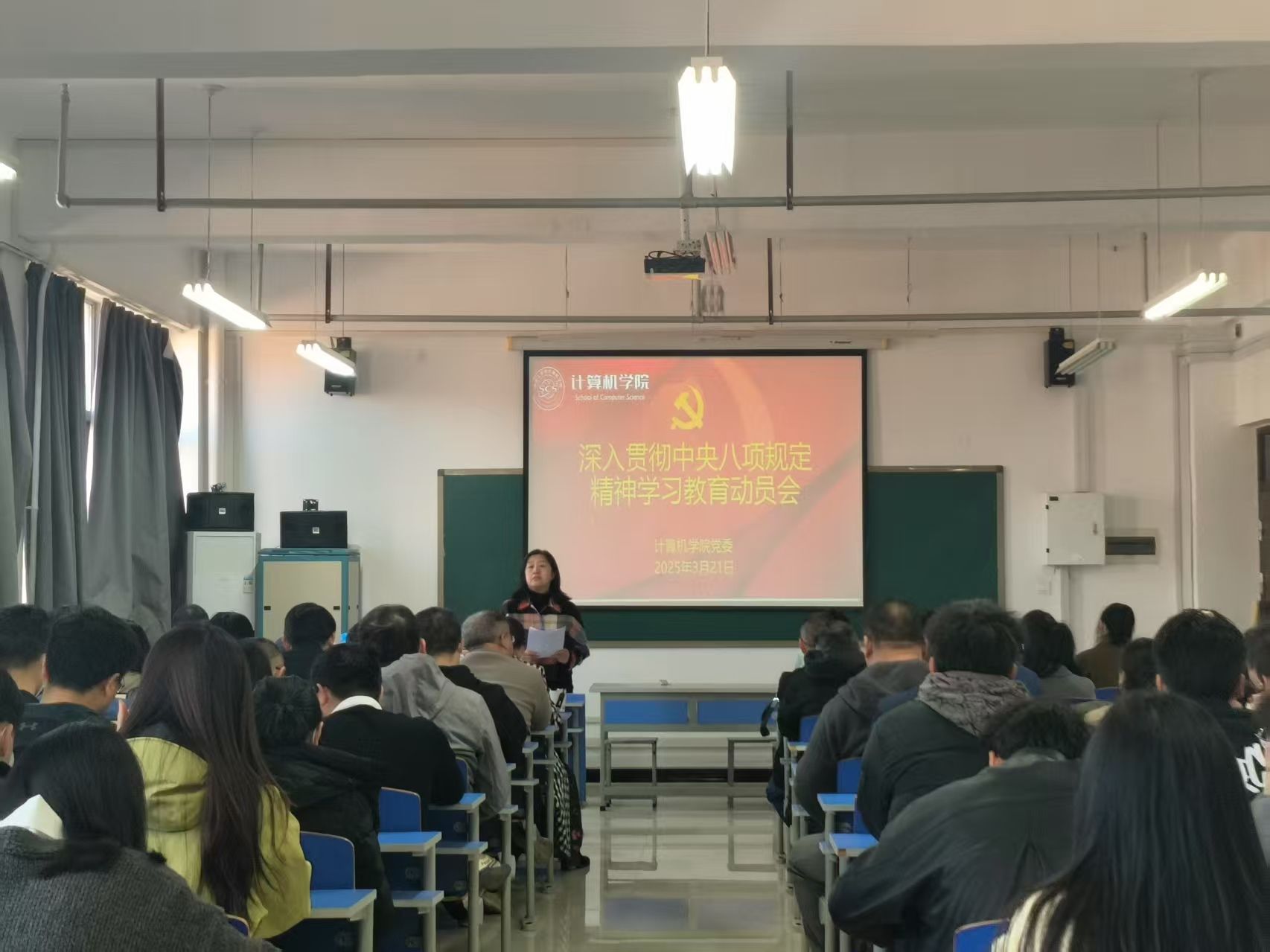 在3号组团楼A908会议室召开了深入贯彻中央八项规定精神学习教育动员会,传达学习党中央、学校党委关于深入贯彻中央八项规定精神学习教育的部署要求,启动学院深入贯彻中央八项规定精神学习教育工作。学院党委书记苗凤君主持会议并做动员讲话,学院全体师生党员参加了会议。
