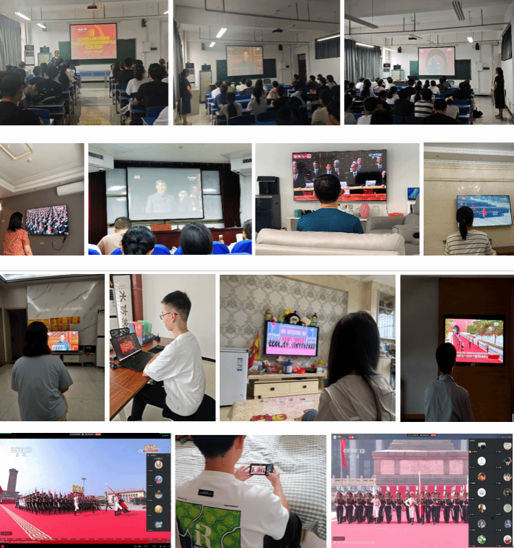 学院提前部署,通过多种途径发布通知,明确收看时间、直播平台及活动要求。上午9时,阅兵式正式开始,在校师生近七十人齐聚908主会场,其他师生则通过手机、电脑、线上会议等方式,共同观看这场庄严的盛典。