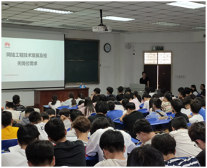 针对18级开展了关于信息安全及网络工程的专题讲座。参加本次讲座的人员包括信息安全刘伎昭老师及新华三集团的田野老师、网络工程张茜、潘磊、冯国朋老师、18级辅导员侯向花老师及全体18级学生。