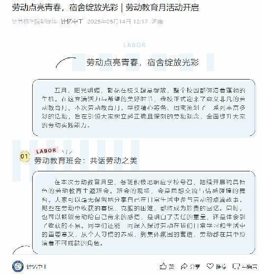 5月14日,学院利用“计忆中工”微信公众号平台,发布了以“劳动点亮青春,宿舍绽放光彩”为主题的推文。推文通过图文并茂的形式,激励同学们在劳动中磨炼意志,在实践中积累经验,不断成长进步。