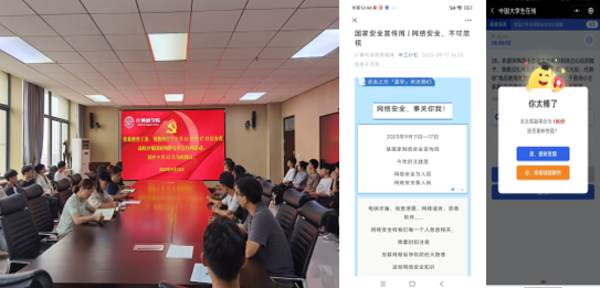 学生干部骨干,学习国家网络安全宣传周文件要求,以生动案例引导学生树立正确的网络安全观,提升网络安全素养。在9月11日至17日的宣传周里,我院各班级、党、团支部围绕国家网络安全宣传周主题,通过主题班会、主题党(团)日、网络安全知识答题、反网络电信诈骗培训等活动,学院“中工计忆”微信公众号也进行了推文宣传,对广大学生、党团员进行全方位的网络安全教育。