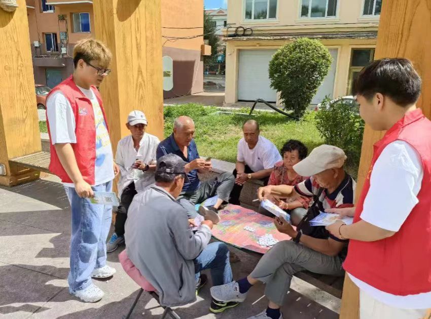 实践团队在居民社区分发宣传材料宣传法律知识