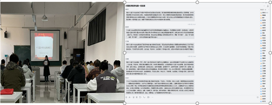 学生第一党支部组织全体支部成员在3组A907教室开展集中学习,收听收看全会相关报道,专题学习全会精神。