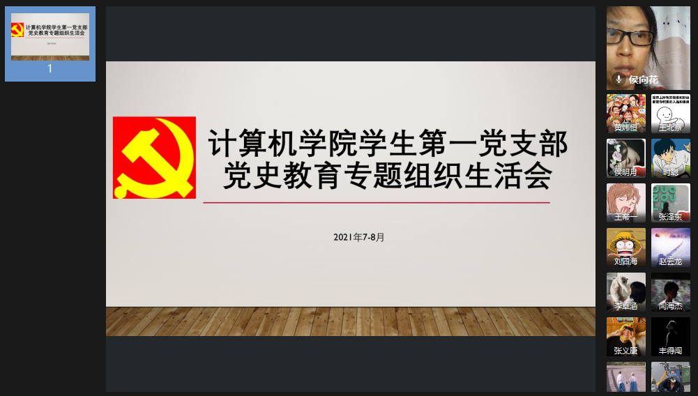 学生第一党支部的党史学习教育专题组织生活会,由书记侯向花老师主持。侯老师向支部全体党员报告支部上半年工作情况与党史学习教育情况并通报党支部委员会检视问题情况。半年来,学生第一党支部按照“学史明理、学史增信、学史崇德、学史力行”要求,通过党员自学、参加发展对象、预备党员、正式党员培训班,学院党史动员会、赵茜老师党史讲座、“二七纪念馆”党史实践教育、“党史故事分享交流会”、“我为群众办实事”毕业生党员捐书赠书活动、防汛抗洪及抗疫志愿服务等,开展党史学习,党员收获较大。但同时存在党史学习教育缺乏系统性与连贯性、支委会成员与支部党员沟通不足、“我为群众办实事”不深入不广泛等问题。