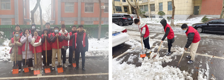 在除雪志愿服务活动中,身穿志愿者红马甲的我院党员、积极分子,不畏严寒、通力配合,有从学校借到的铁锹、有从宿舍带来的搓斗,有轮番上阵攻克坚冰的、有挥舞扫帚扫雪不停的,大家热火朝天开展一场劳动竞赛。经过接续奋战,3号组团北的主干道及我院分管清洁区的道路积雪清扫初见成效,打通了师生便利出行通道。