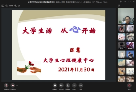 大学生心理健康中心陈慧老师担任主讲,学院2021级全体本科新生参加。