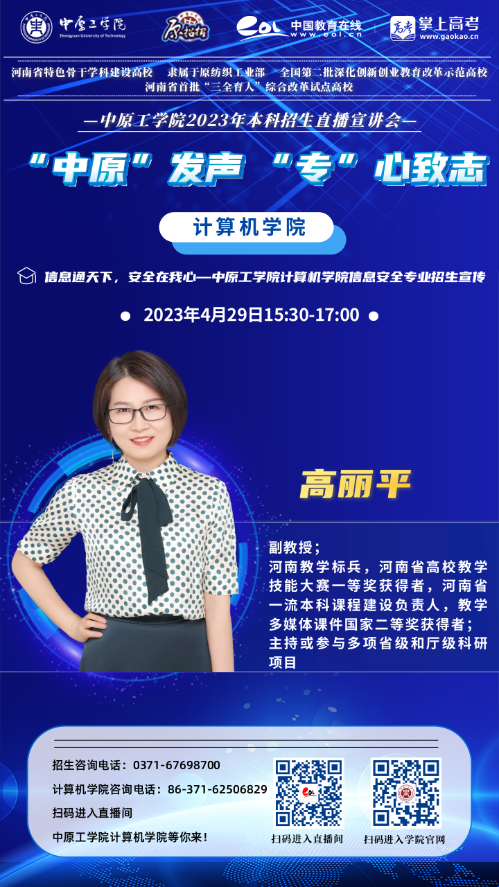 特聘教授4人,省级教学名师2人,河南省优秀教师2名。计算机科学与技术专业为国家一流本科专业、2020年通过国家工程教育专业认证,网络工程系为河南省一流本科专业。学院拥有省级教学团队1个、省级优秀基层教学组织2个、省级一流课程7门,省级虚拟仿真实验项目2个,获得省部级教学成果奖38项,出版教材五十余部。